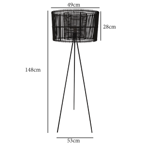 Product Specifications: 148 cm high, 49 cm diameter black rattan shade with metal tripod, this lighting product is ETL listed, which means it has been tested and approved to meet the safety standards set by the US government.