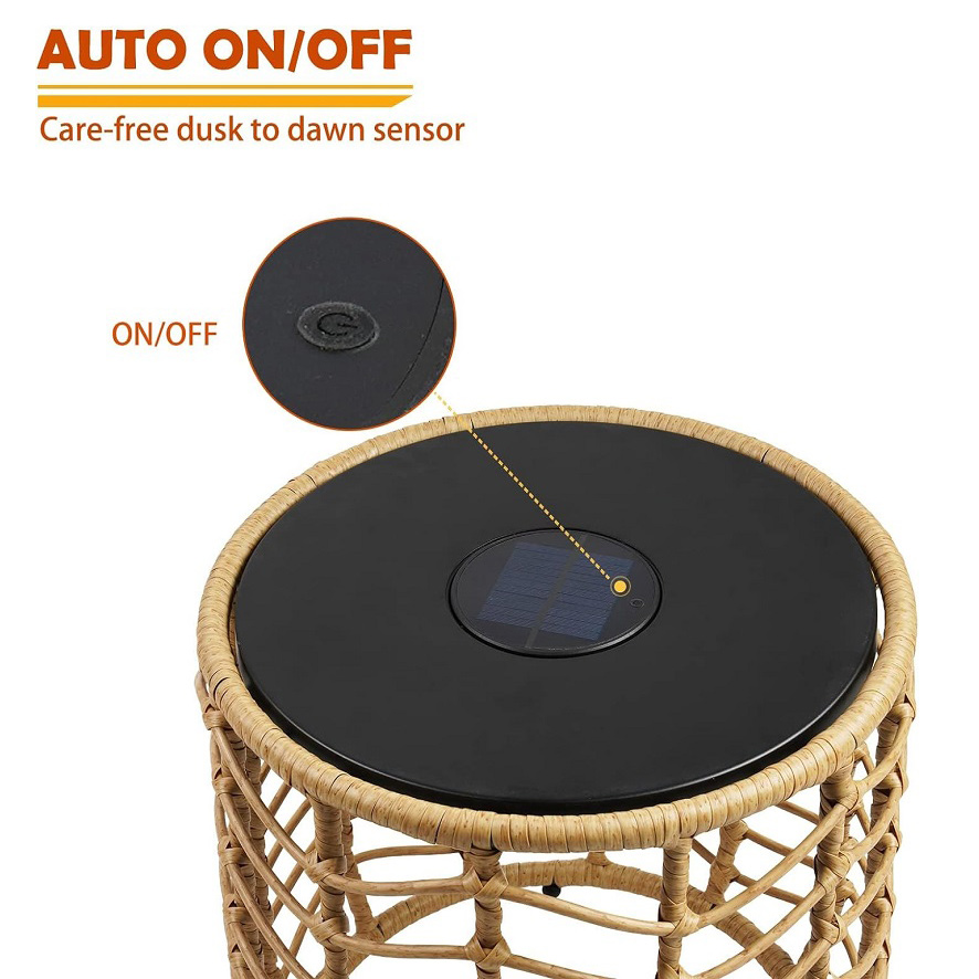 This beautiful rattan solar table lamp is a perfect combination of traditional craftsmanship and modern technology. It is not only a lighting fixture, but also a small table. It is very suitable for placing items such as water cups and books. The hand-woven shape not only adds a natural atmosphere, but also a beautiful work of art.