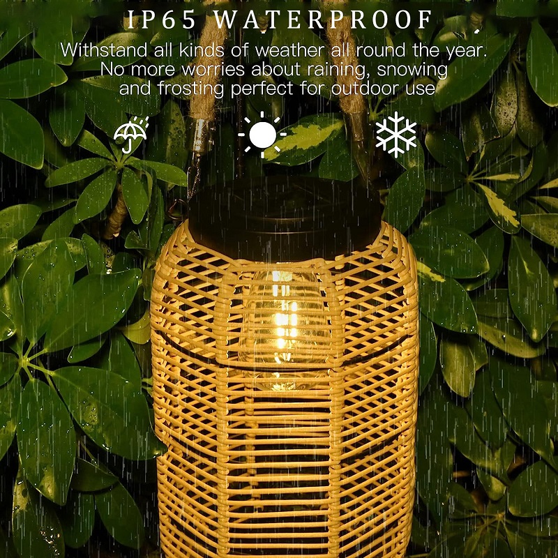 This rattan solar lantern outdoor hanging is equipped with polycrystalline silicon solar panels and built-in light sensor. It can automatically turn on/off, the built-in sensor can automatically turn on the light at dusk, providing you with warm light until late at night.